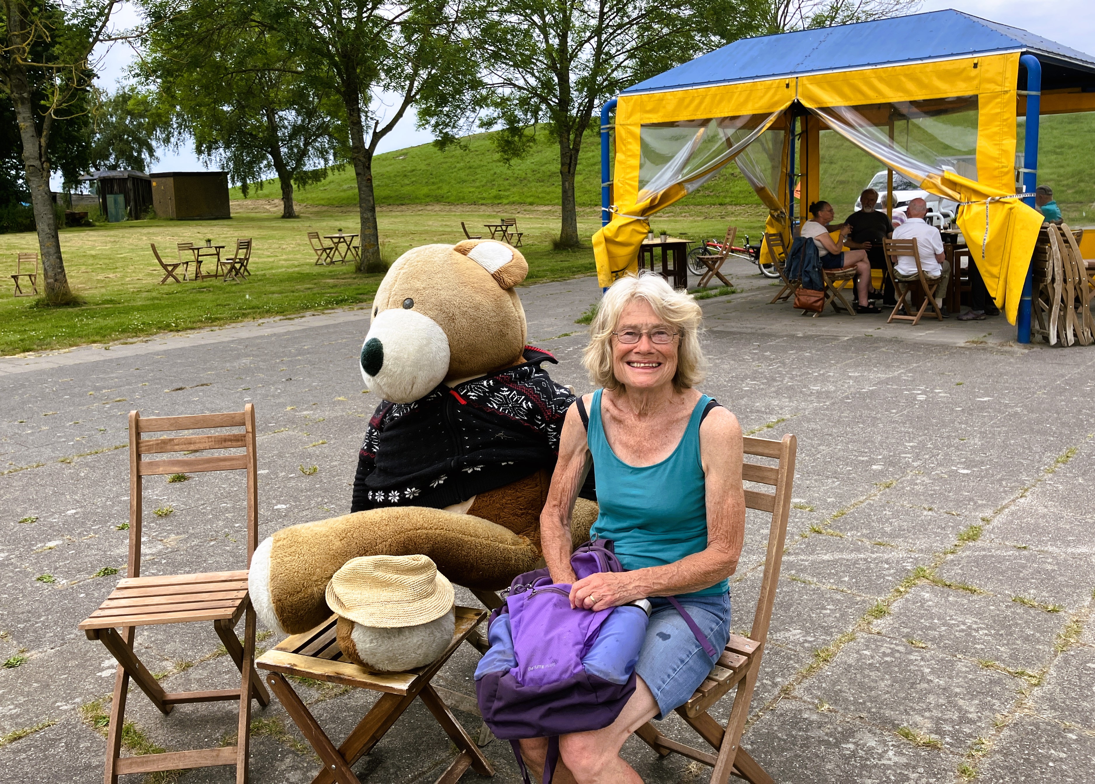 We walked back to the sluice gate where there was a café. After coffee sitting with a big teddy bear at a cafe, we had some bread and cheese in the van. The bear kept Janet’s hat on his lap as we left!