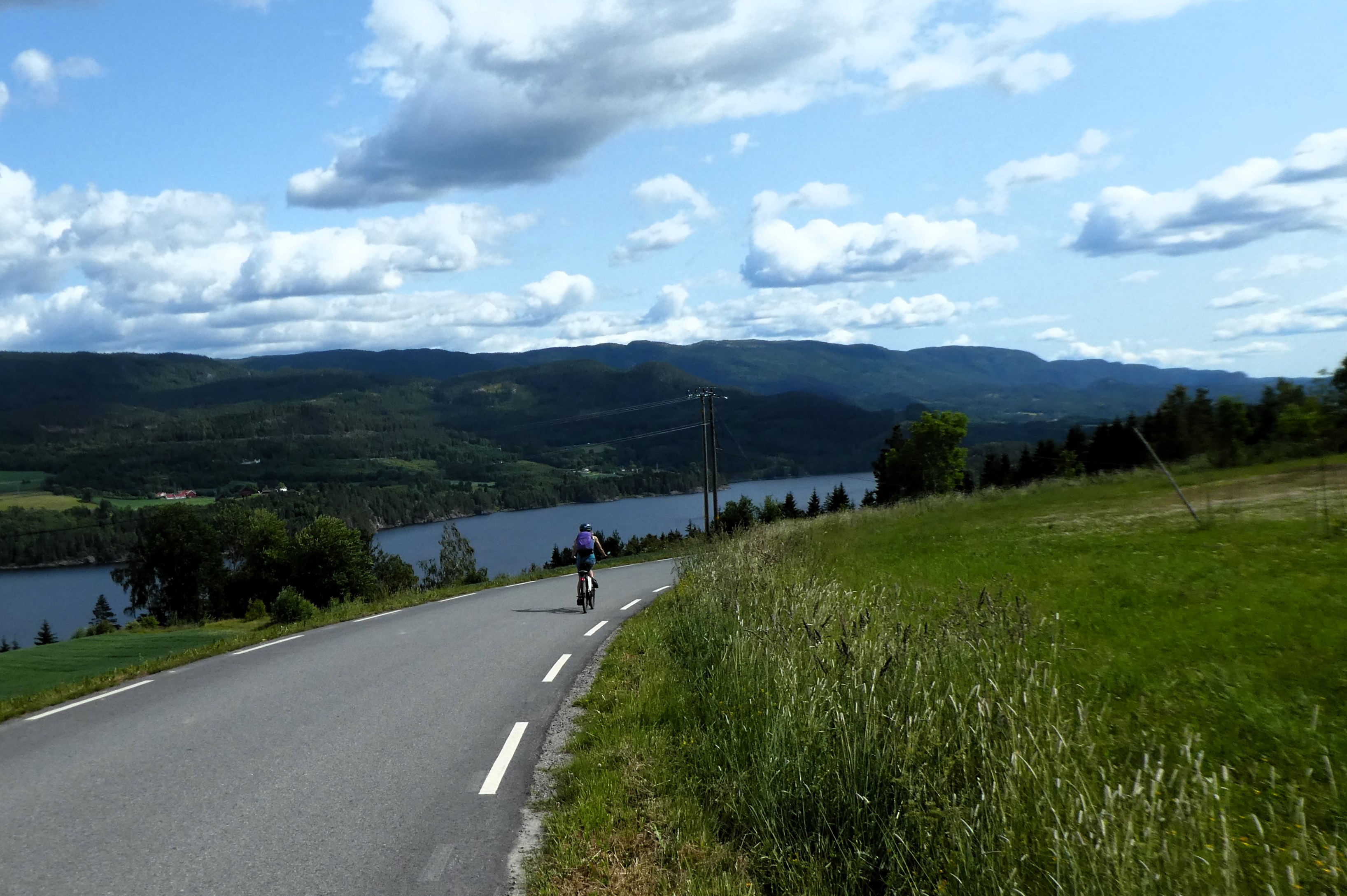 We followed a quiet tarmacked road along the lakeside and down a busy settled valley. After the airport we joined a cycle track to Heddal.