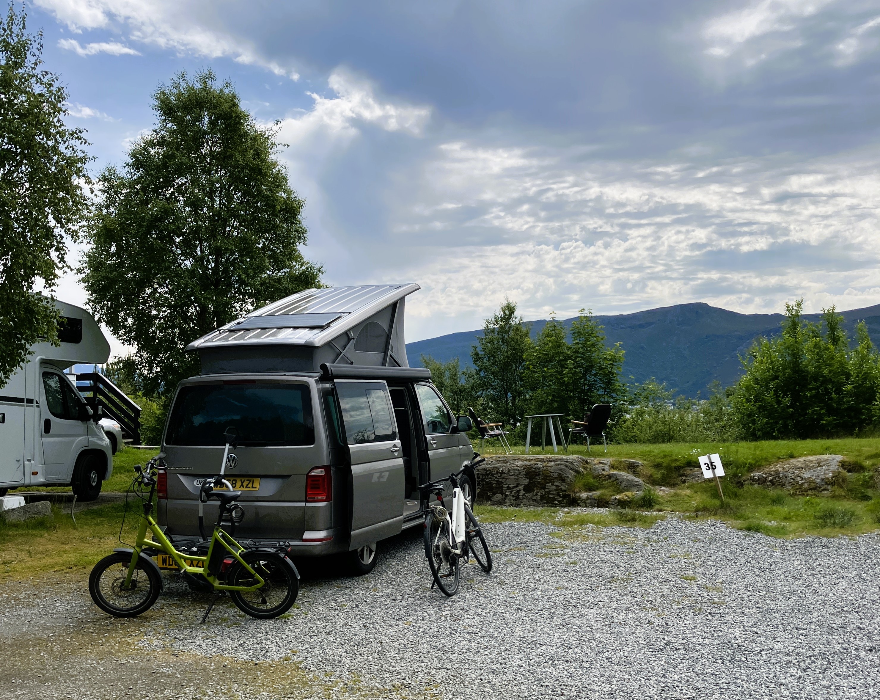 Lovely to wake and have breakfast looking over the peaceful lake. We charged up the electric bikes just on the inverter in the van. Great rejoicing!
