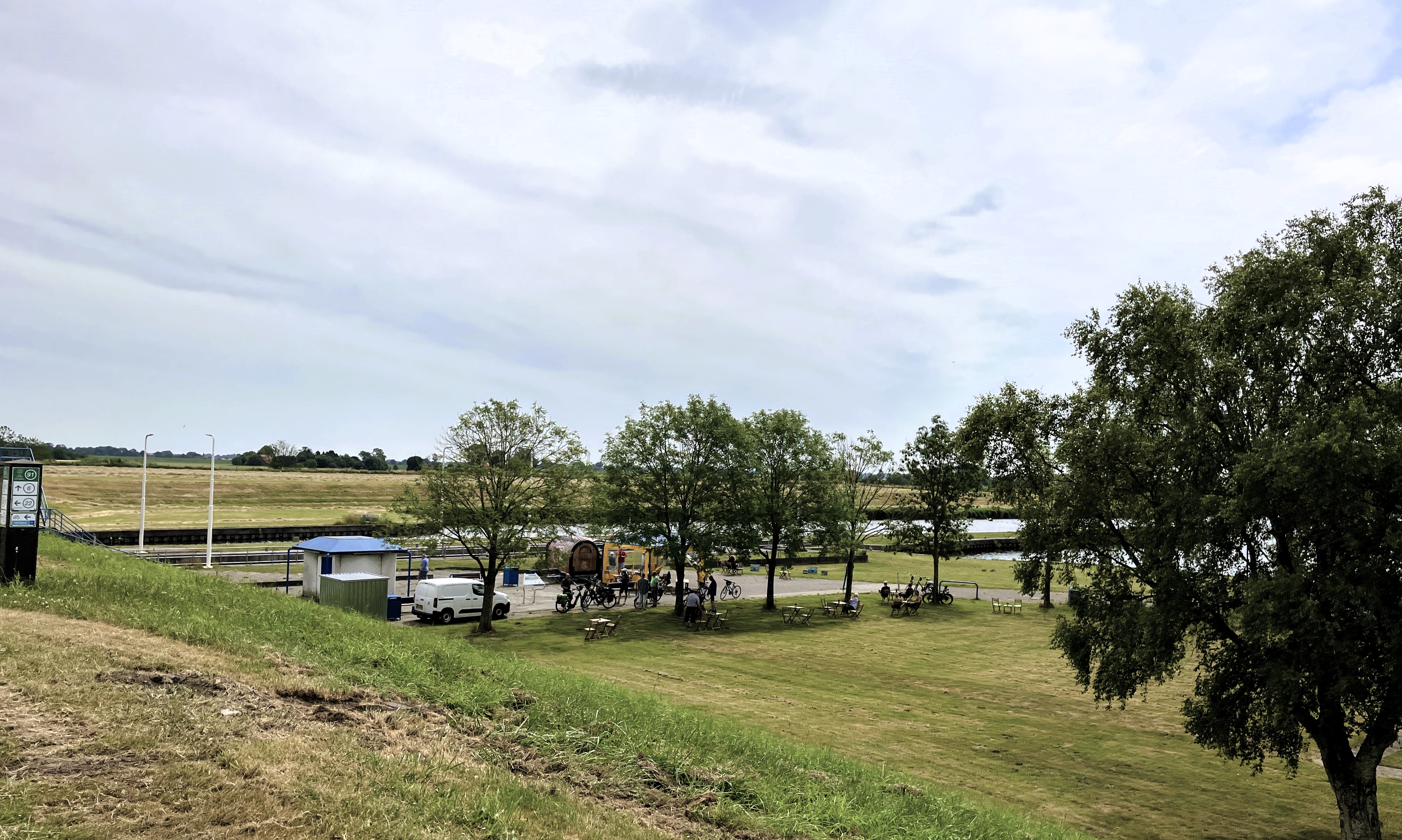 We walked back to the sluice gate where there was a café. After coffee sitting with a big teddy bear at a cafe, we had some bread and cheese in the van. The bear kept Janet’s hat on his lap as we left!