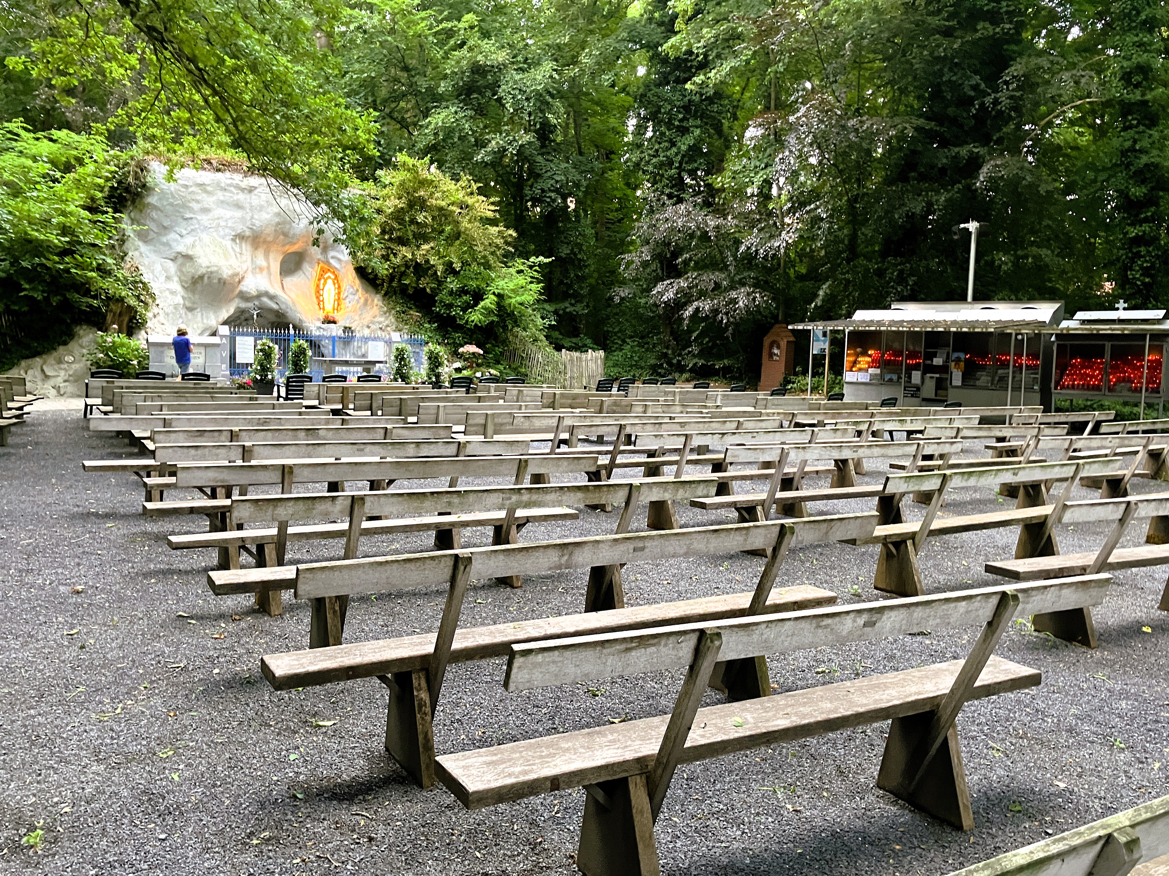 After something to eat we walked into the town and found a Grotto. It was the first cave founded in France in 1860 in honour of Our Lady of Lourdes. The open cave had statues, candles, lights and flowers and a place to purchase candles. In front of the cave there were chairs set out in arcs.