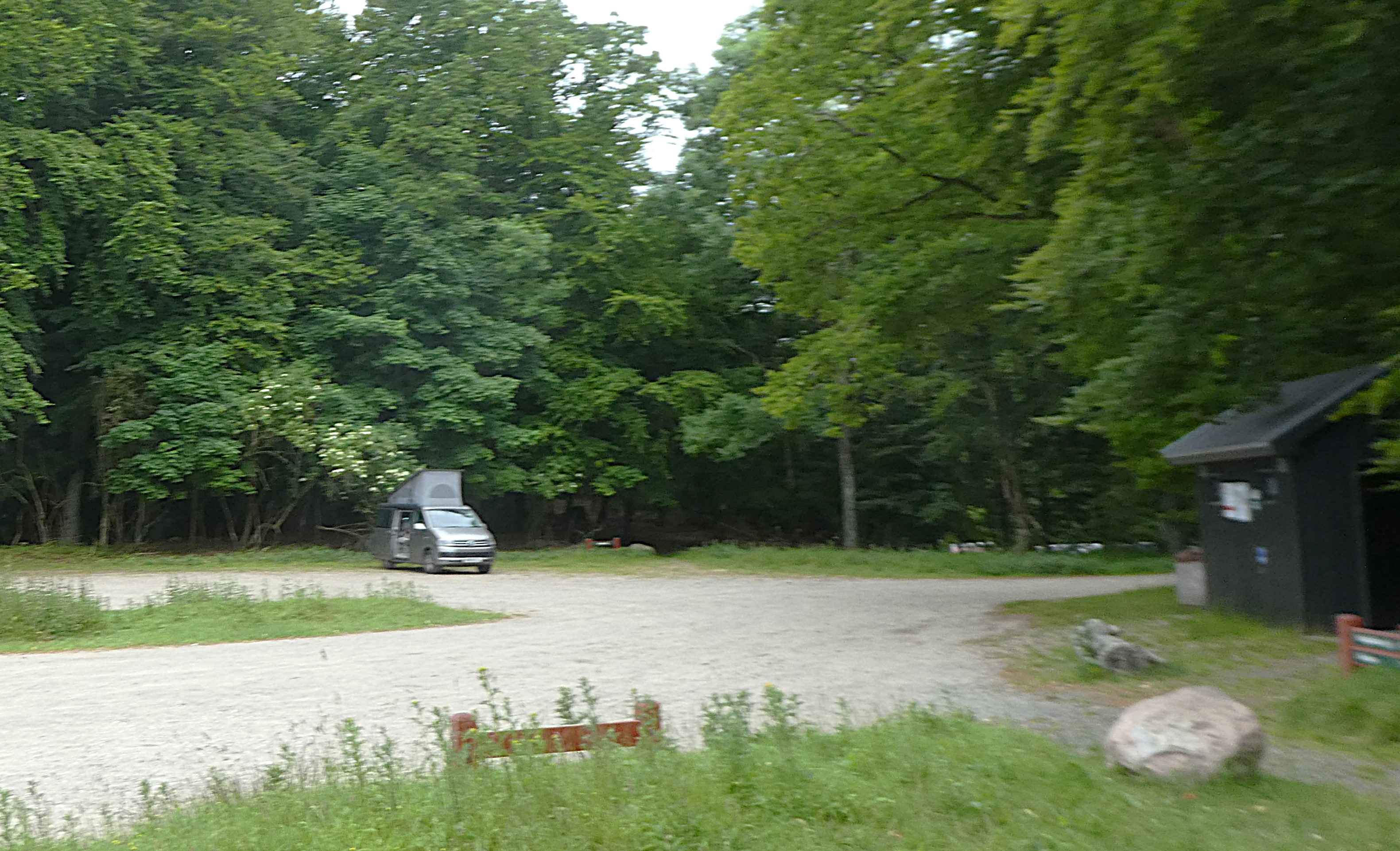 Our wooded car park camping spot was empty when we got there. We went to sleep with the front of the roof open looking through the trees to the moonlight.