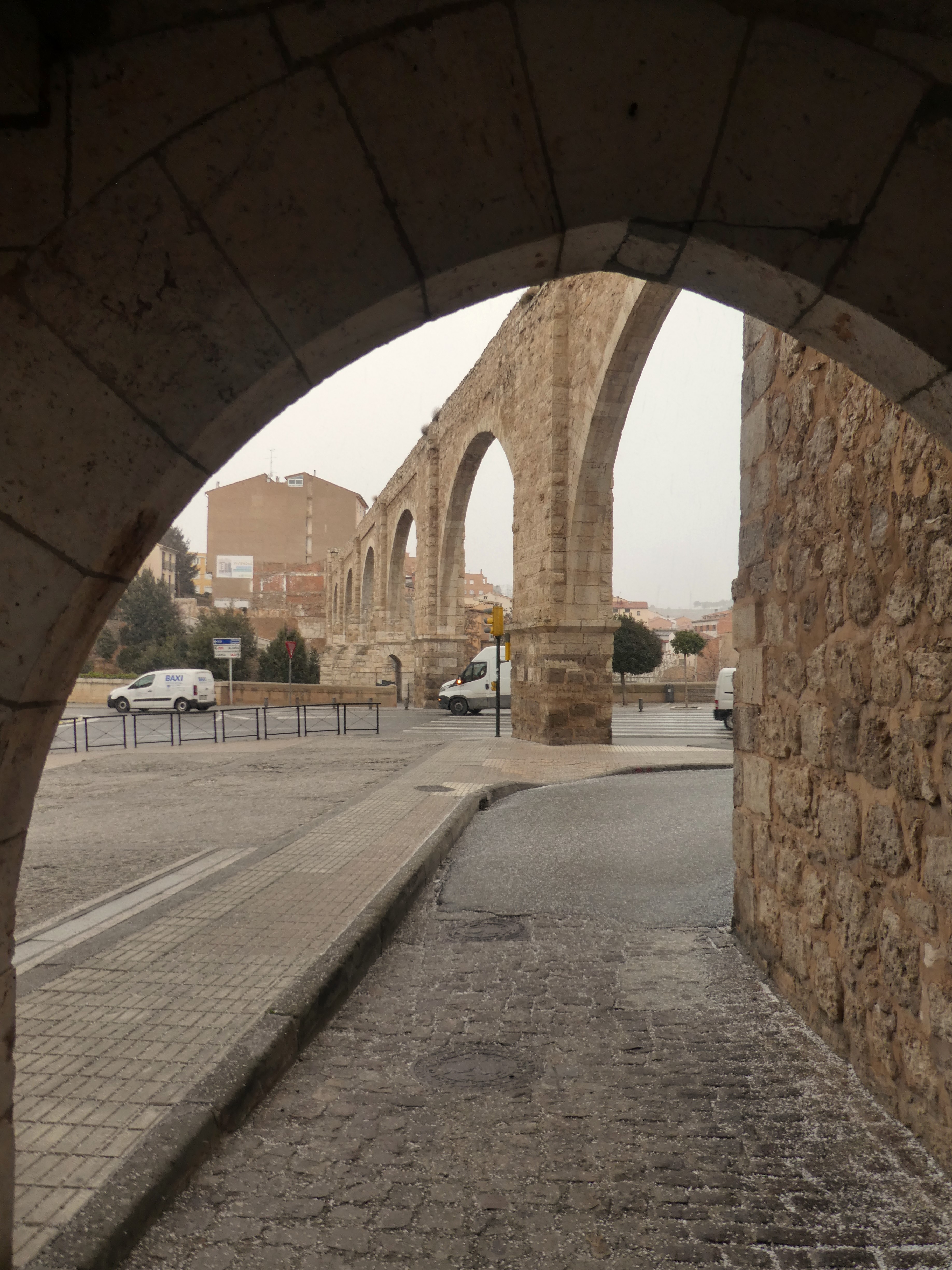 A quick glimpse of the Roman aqueduct before sheltering in some mediaeval arches of the City walls from a blizzard of hail and snow.