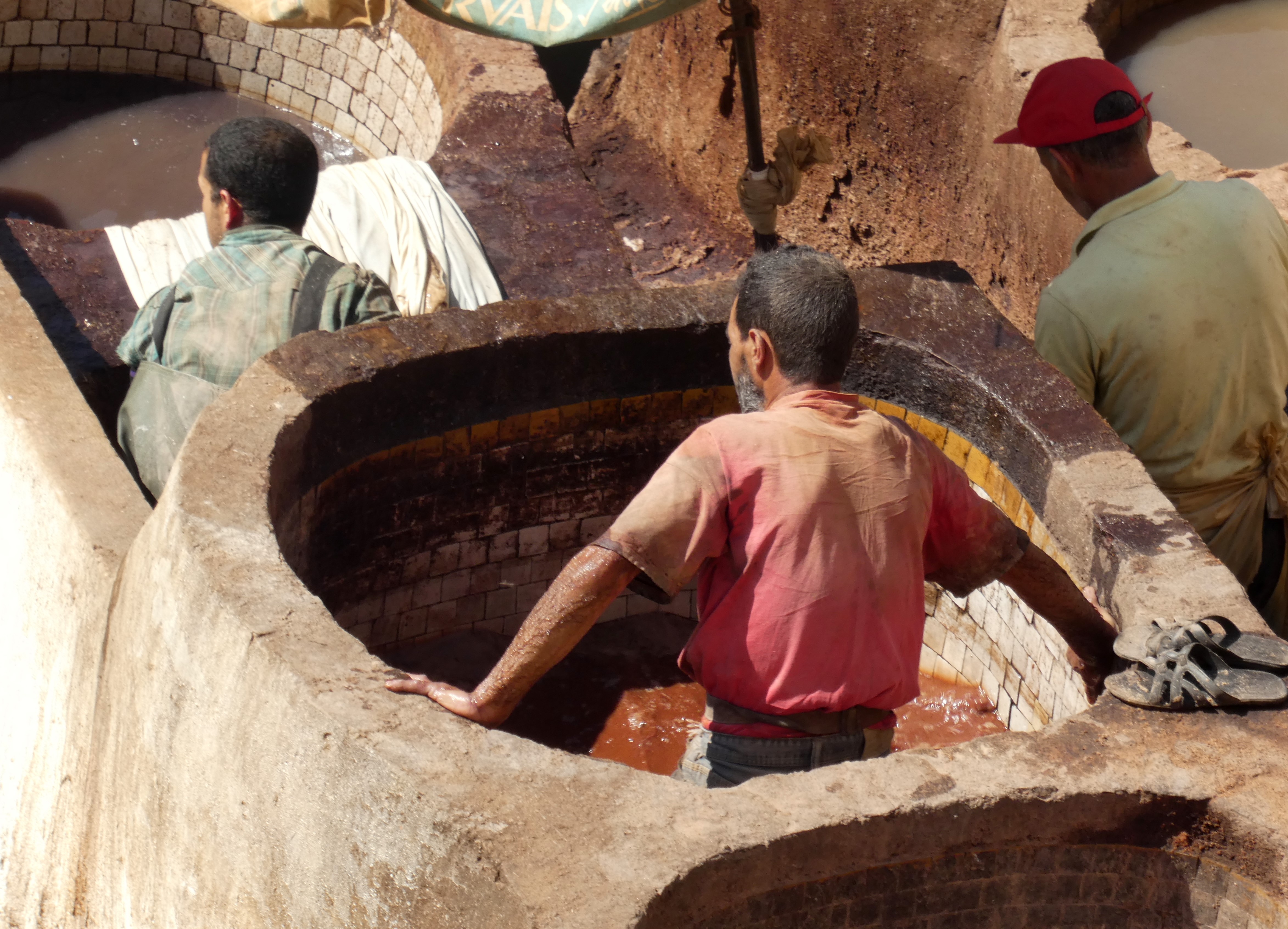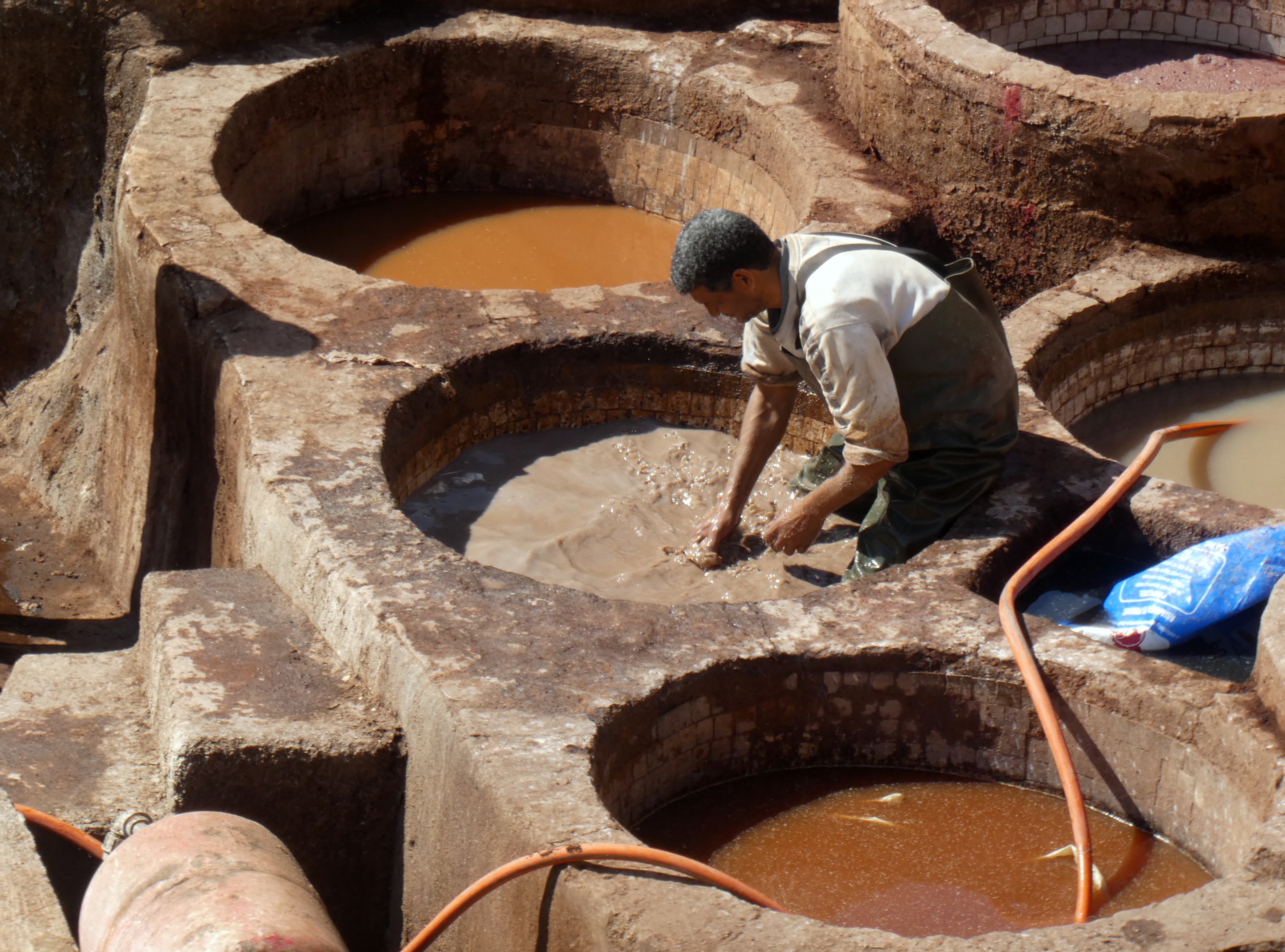 Next was a visit to the Chouara Tanneries. Here a local guide explained the process of first soaking the hides in lime/pigeon poo, salt and vinegar for fifteen days, before washing them well. They were then soaked in one of the natural dyes for two days before being dried in the sun for a further five days.