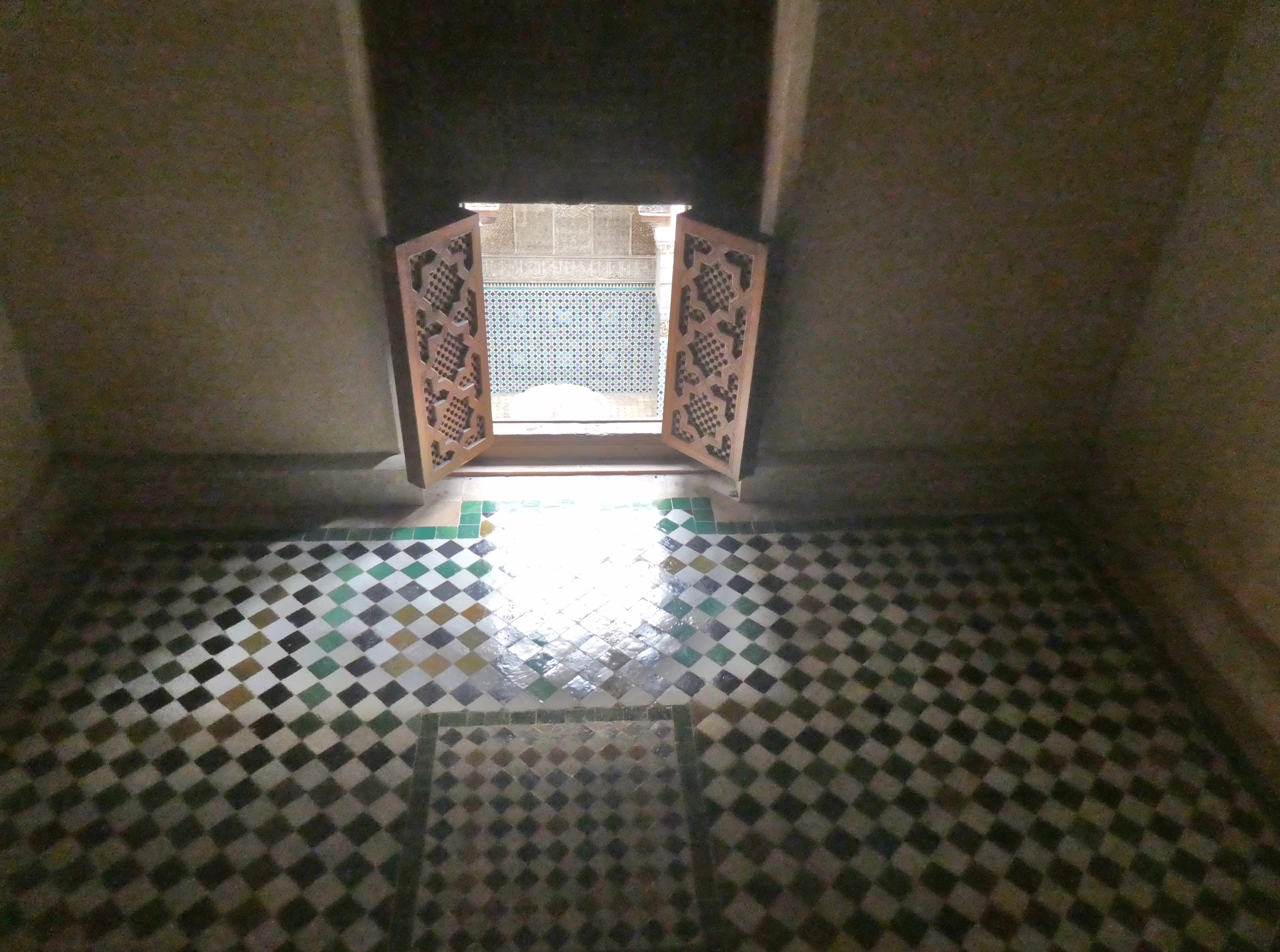 We then stumbled across the Medressa Cherratiene, a part of the old university founded by Moulay Idriss II. It has a lovely fountain courtyard surrounded on the next two storeys by small rooms fot those attending the university to stay in. We had great fun opening doors and exploring cell like rooms with their small wooden latticed windows giving glimpses of the internal courtyard and the surrounding green tiled roofscape.