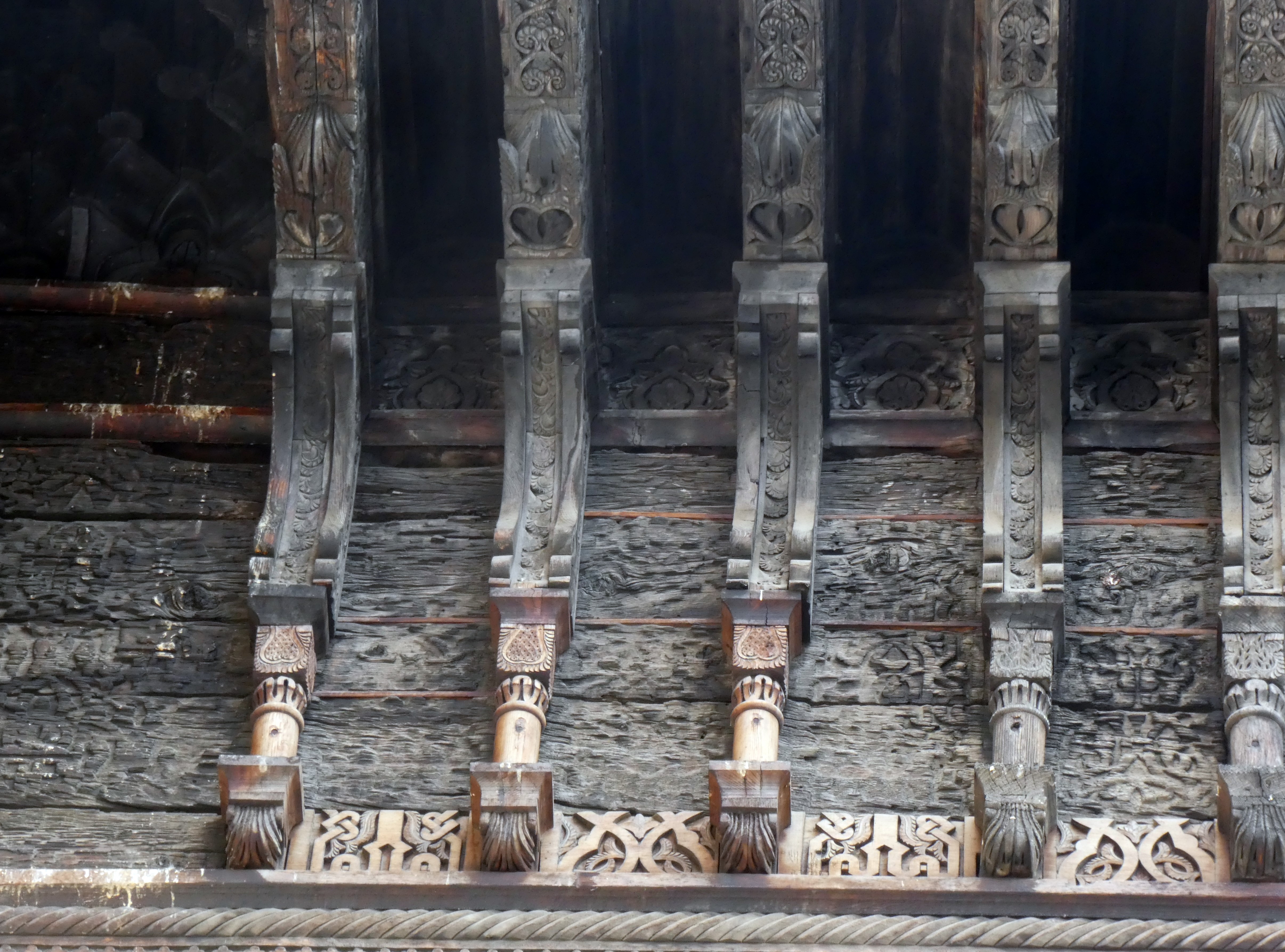 Metal balls were released from twelve little doors into brass bowls on the lower beams to signal the hours. The rafters on the top level originally supported a small roof, now gone.